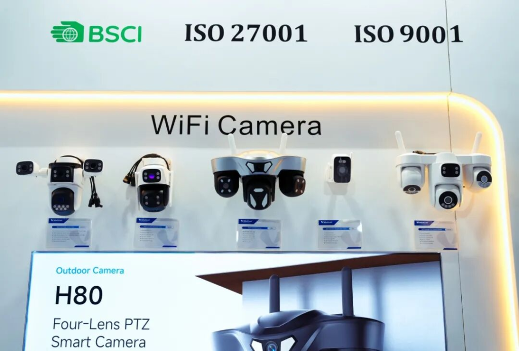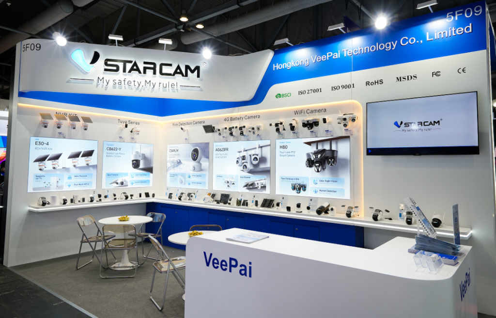 The VStarcam booth featured a sleek, modern design in blue and white, conveying technological leadership and professionalism. Authoritative international certifications including ISO27001、CE、FCC、RoHS were prominently displayed, underscoring the brand’s commitment to product safety, quality management and environmental compliance.